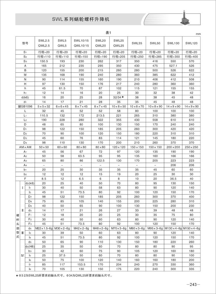 3、丝杆头部型式:1型结构型式的丝杆头部:Ⅰ型(圆柱型)、Ⅱ型(法 兰型)、Ⅲ型(螺纹型)、Ⅳ型(扁头型)