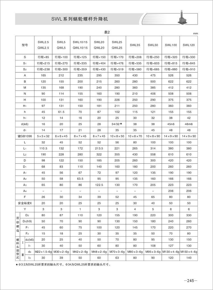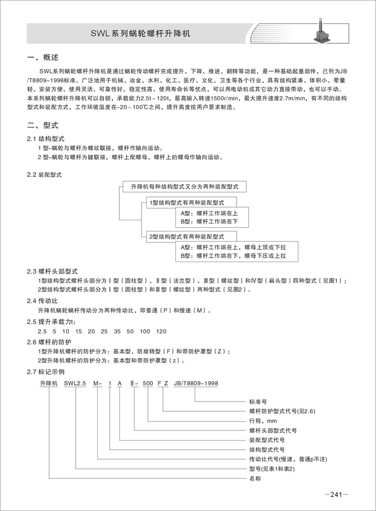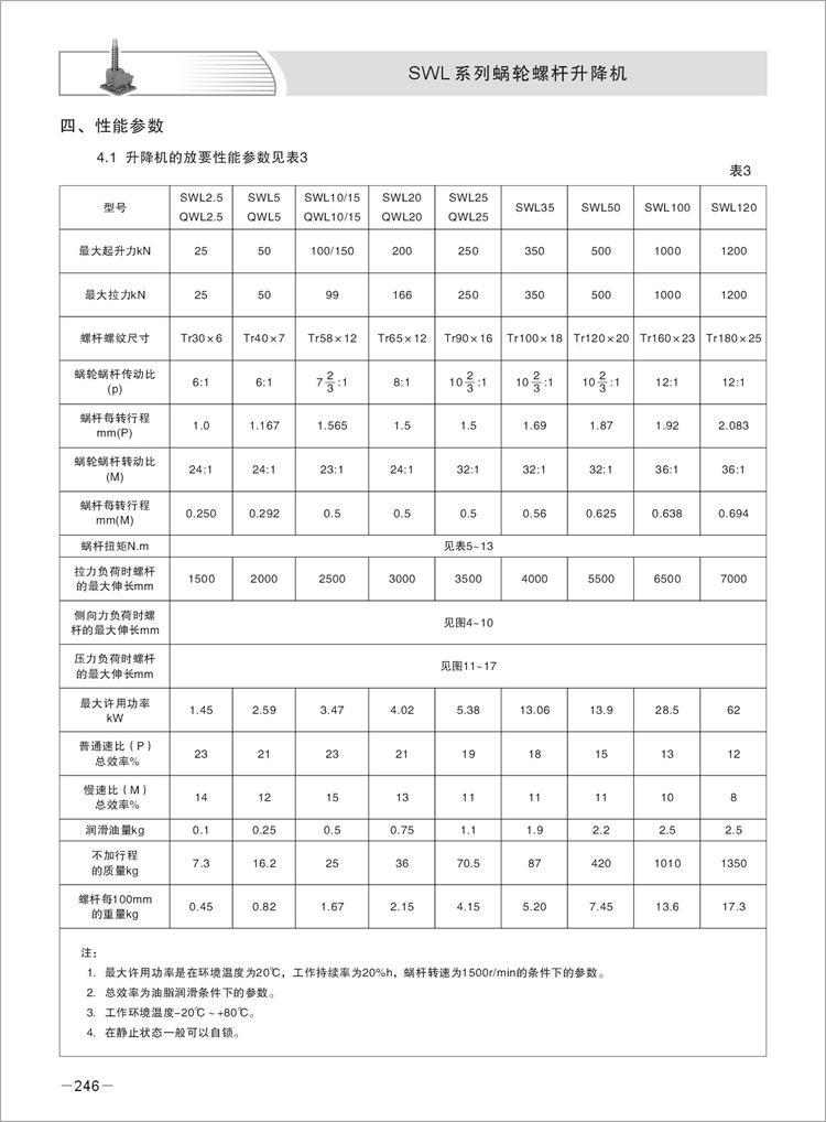 注:SWL蜗轮丝杆升降机大速比具有自锁功能,但在受到较大振动、冲击载荷时,可能会使自锁功能失效,此时请外加制动装置或者配制动电机,以防物体掉落。