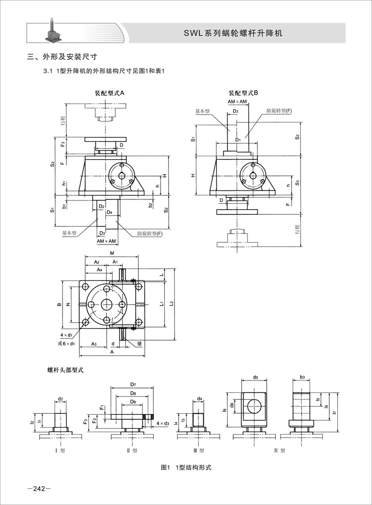 3、丝杆头部型式:1型结构型式的丝杆头部:Ⅰ型(圆柱型)、Ⅱ型(法 兰型)、Ⅲ型(螺纹型)、Ⅳ型(扁头型)