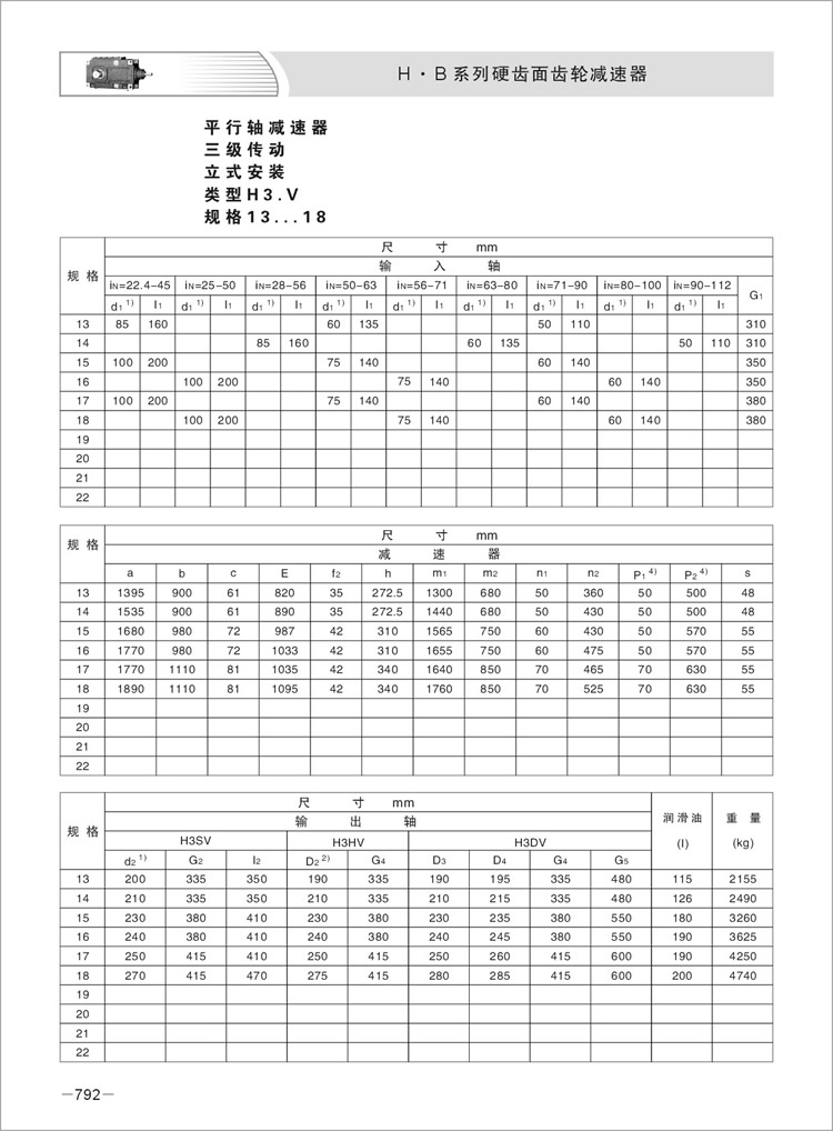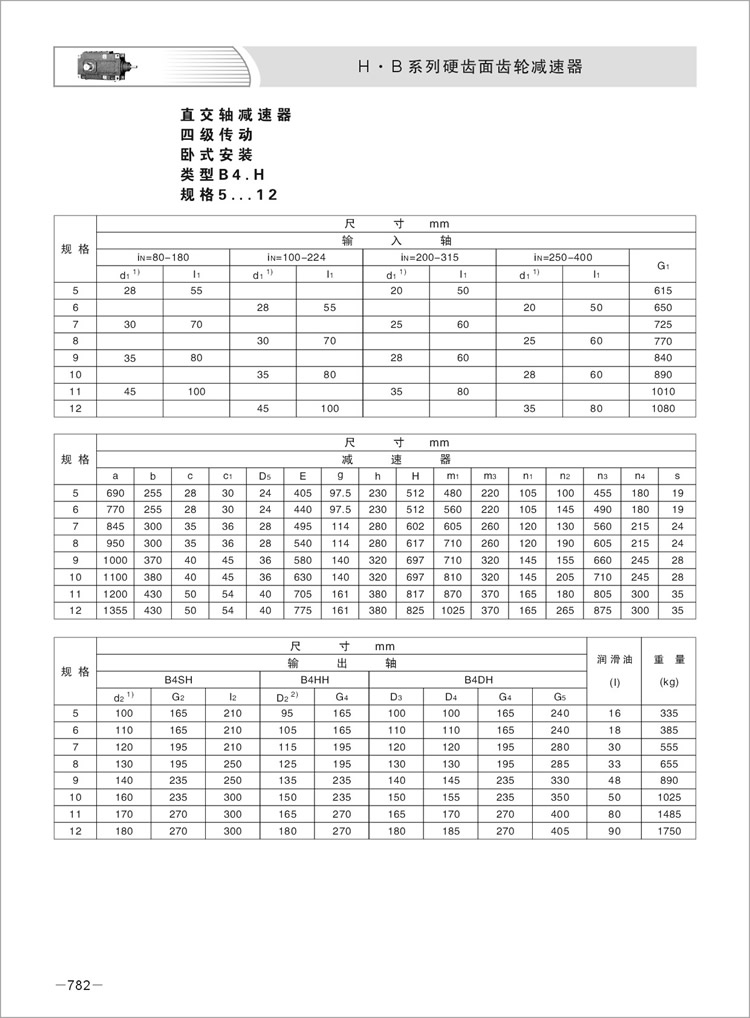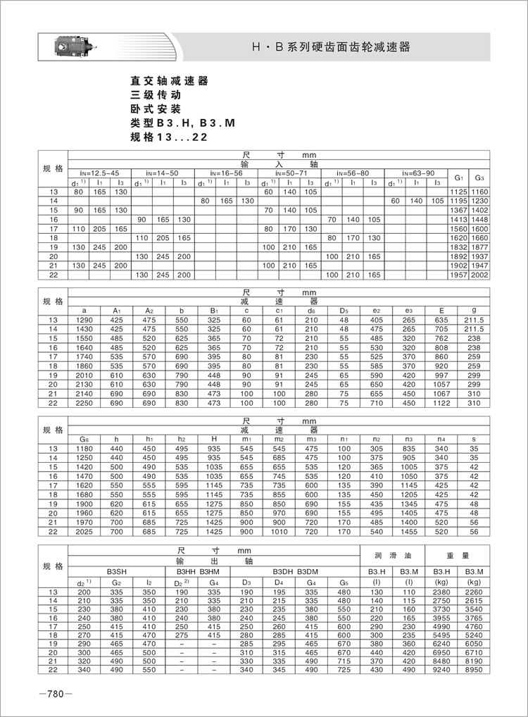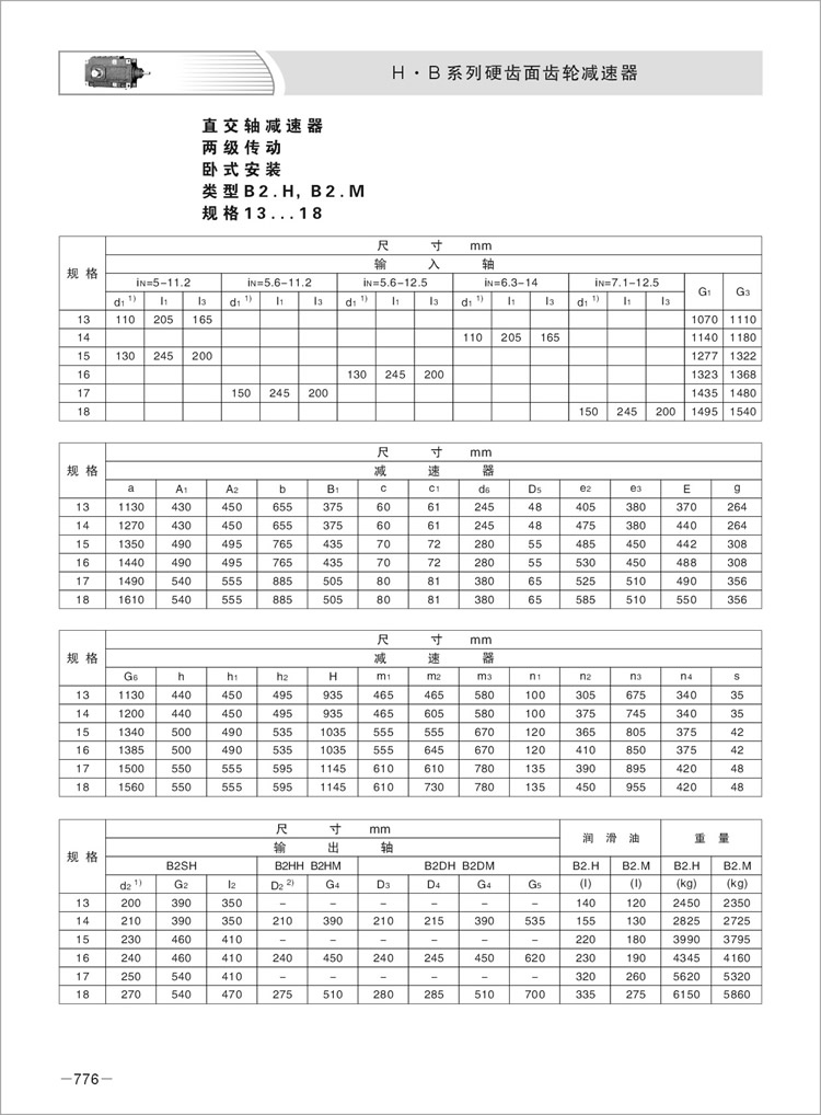 7.H、B系列产品有3~26型规格,减速传动级数有1~4级,速比1.25~450;和我厂R、K、S系列减速电机组合得到更大的速比。
