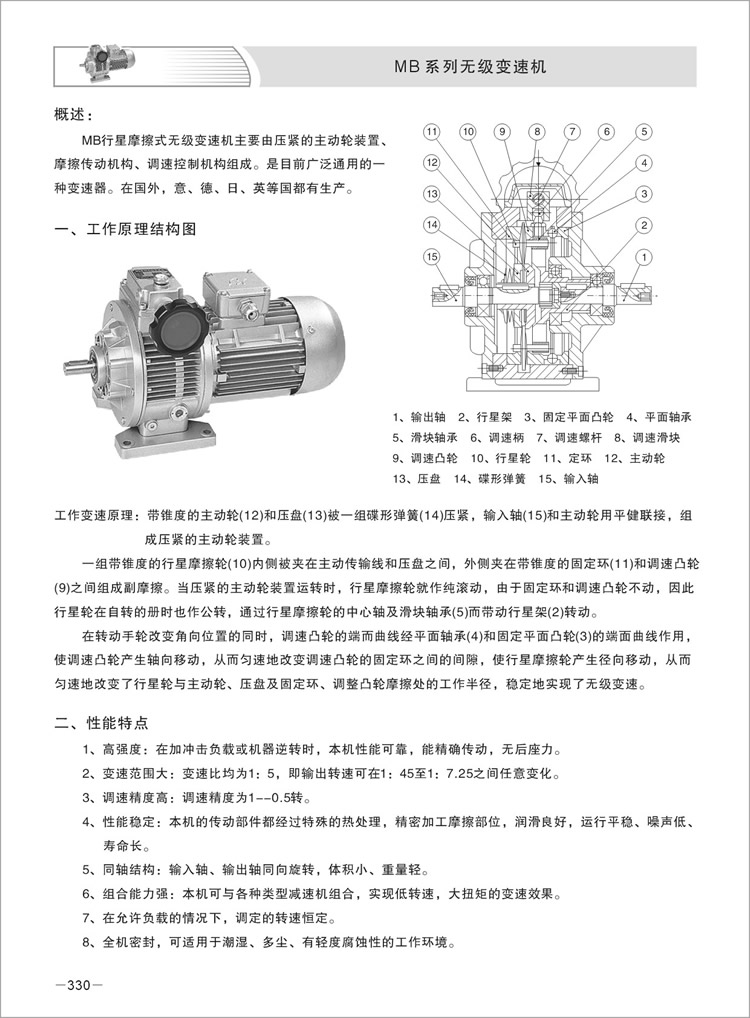 MB系列行星摩擦式机械无级变速机主要由压紧的主动装置、摩擦传动机构、调速控制机构组成。带锥度的主动轮和压盘被一组碟形弹簧压紧,输入轴与主动轮用键联接,而组成压紧的主动装置。一组带锥度的行星摩擦轮内侧夹在压紧的主动轮和压盘之间,外侧夹在带锥度的固定环和调速凸轮之间,而组成摩擦副;当压紧的主动装置运转时,摩擦轮就做纯滚动,由于固定环和调速凸轮不动,因此,摩擦轮在自转的同时作公转运转,通过行星摩擦轮的中心轴及滑块轴承而带动行星架转动。 转动手轮带动调速凸轮改变角向位置的同时,调速凸轮的端面曲线经平面弹子夹和固定凸轮的端面曲线作用,使调速凸轮产生轴向移动,从而均匀改变调速凸轮和固定环之间的间隔,使锥度行星摩擦轮产生径向移动。后均匀地改变了行星摩擦轮与主动轮、压盘及固定环、调速凸轮摩擦处的工作半径,实现稳定的无级变速。