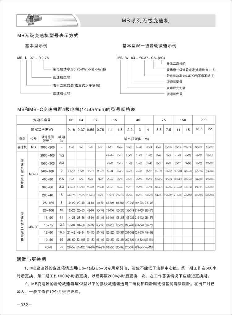 1、MB无级变速机专用润滑油必须使用Ub-1或Ub-3牵引液,在任何情况下,要确保牵引液按油标定量提供。变速器在工作500小时后,应更换牵引液,再工作1000小时更换一次,以后每隔2000工作小时左右更换一次牵引液。