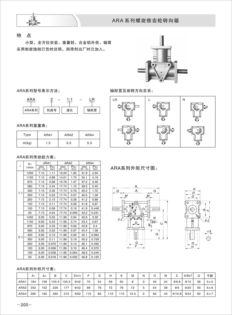 ARA系列螺旋锥齿轮转向箱采用科学的设计方案,是传动设备行业不可缺少的产品。ARA系列转向箱性能优良,重量轻、体积小、载重大;外壳坚固,采用优质铝合金压铸而成;外型美观,设计合理,可正反运转,输入、输出方式采用多方位结构,且输出方式多样。适用范围广、扭矩大、噪音低、寿命长。