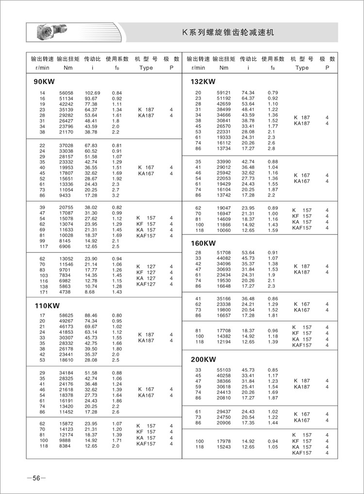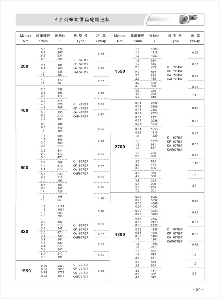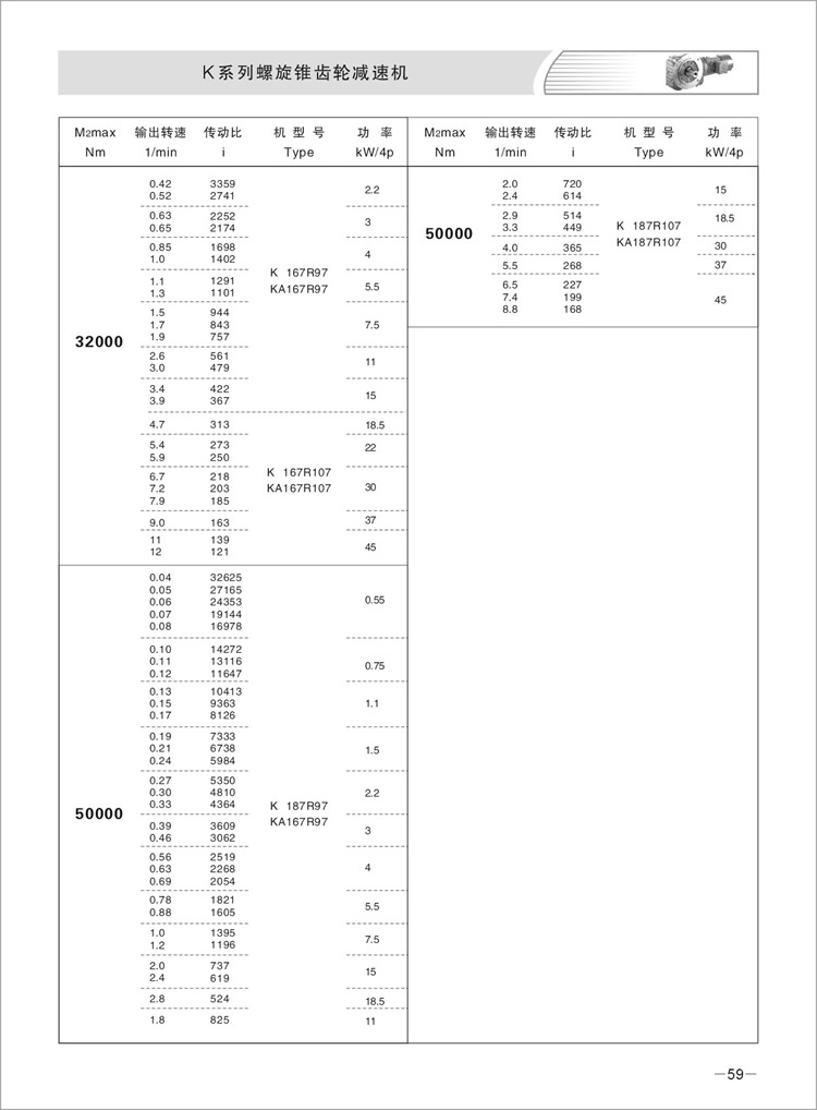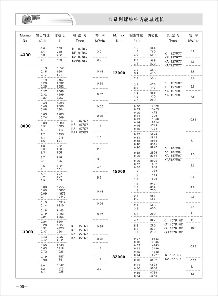 速比范围:基本型5.36~197.37,K系列/R系列组合型可达到32625