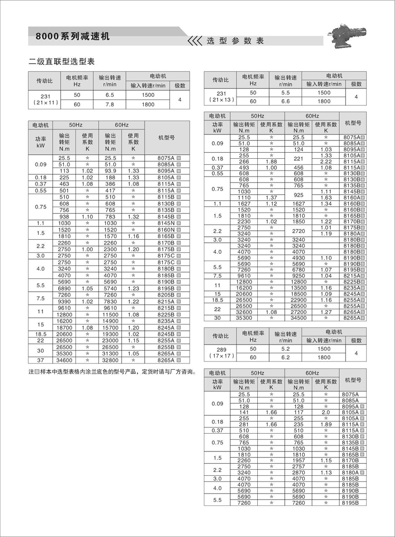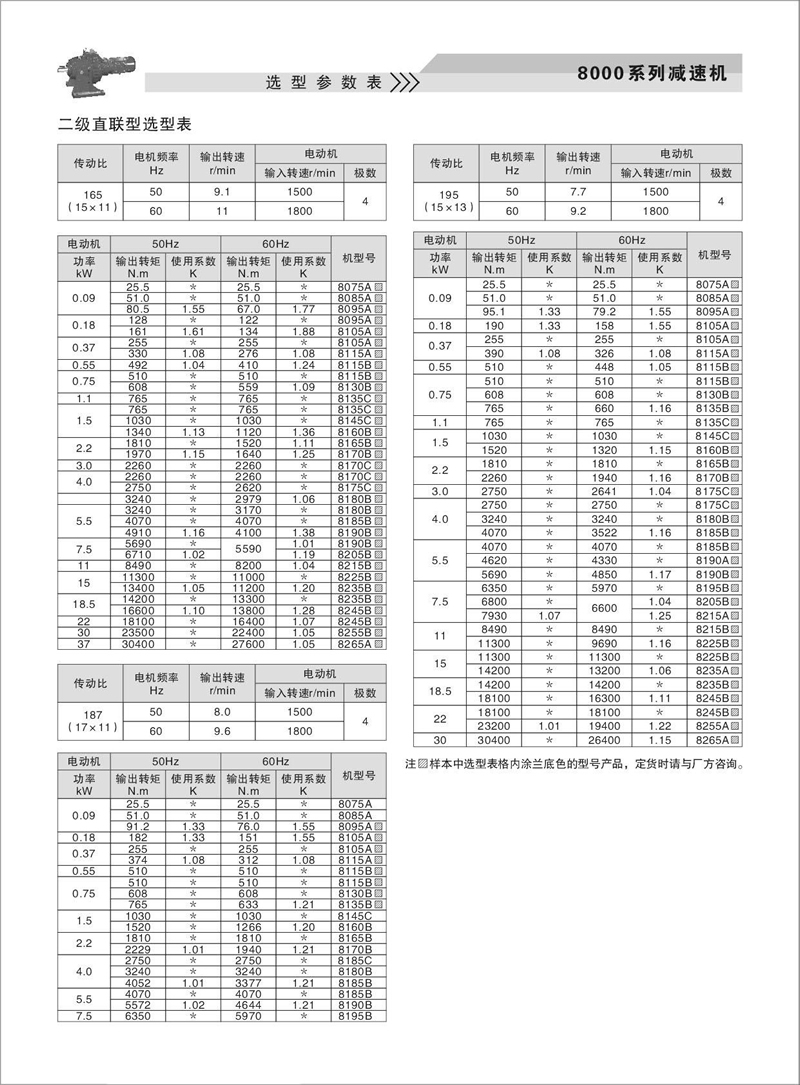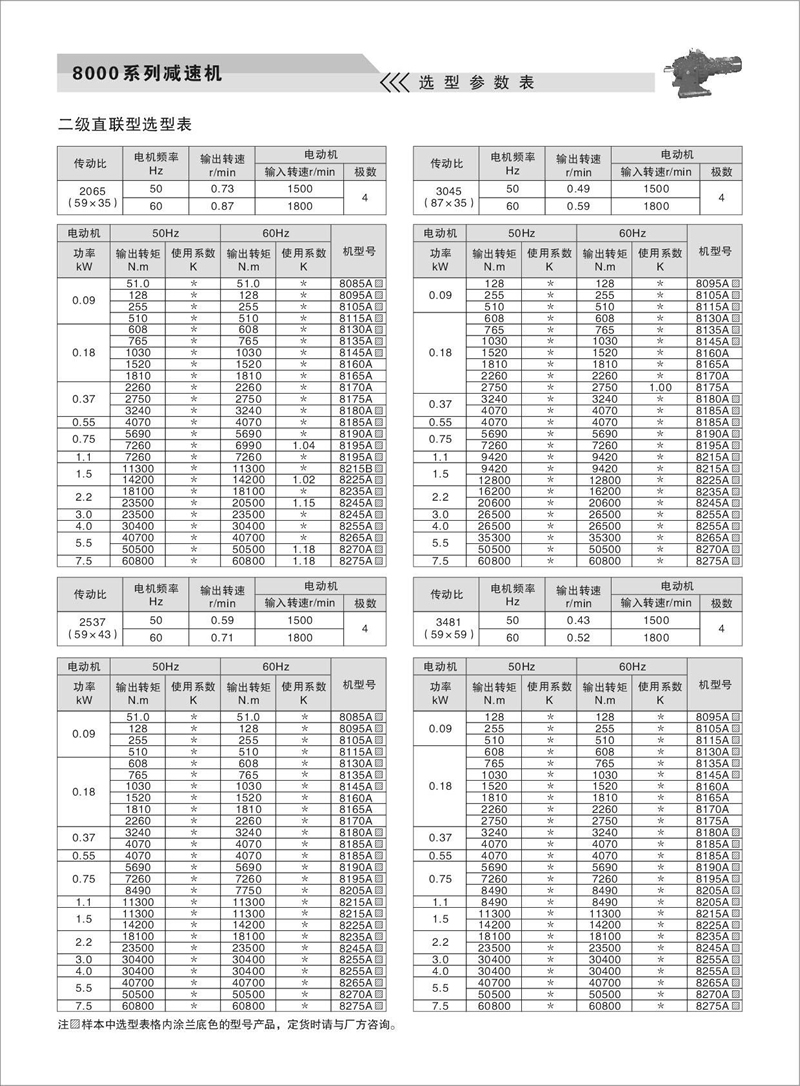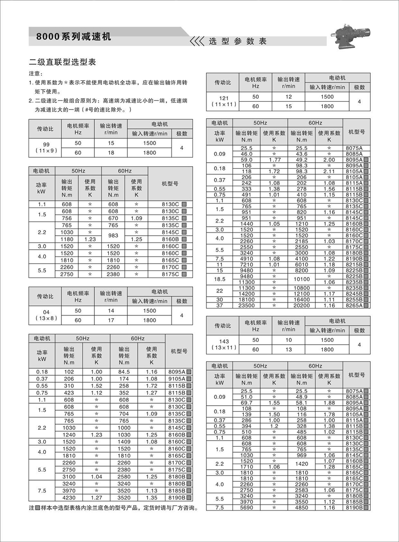 网站首页> 技术参数> 8000系列针轮减速机选型参数表(二级直联型)